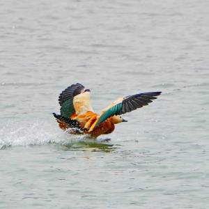 凤头䴙䴘在虎头山水库的水面上飞翔(4月24日摄)。