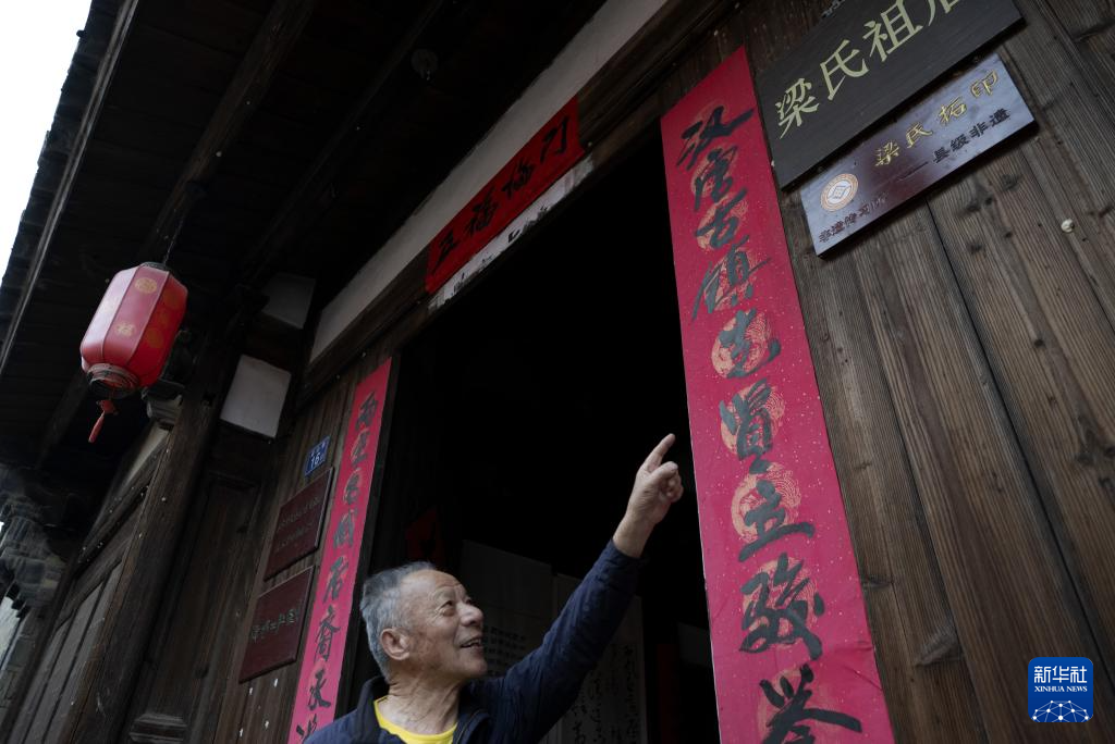 在泰宁县尚书巷历史文化街区进士巷16号,屋主梁光蔚在介绍梁氏祖居和县级非物质文化遗产——梁氏拓印(4月19日摄)。