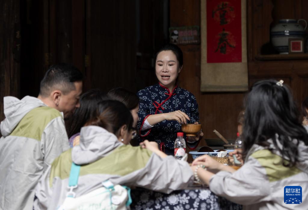 在尚书巷历史文化街区的大龙擂茶传承所,非遗传承人李华给来自厦门的游客制作擂茶(4月19日摄)。
