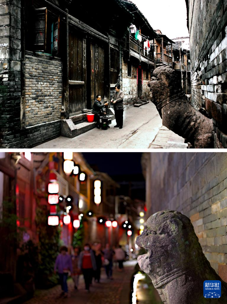 拼版照片:上图为尚书巷历史文化街区九举巷(资料照片);下图为同一地点拍摄的修缮后的尚书巷历史文化街区九举巷(4月19日新华社记者魏培全摄)。