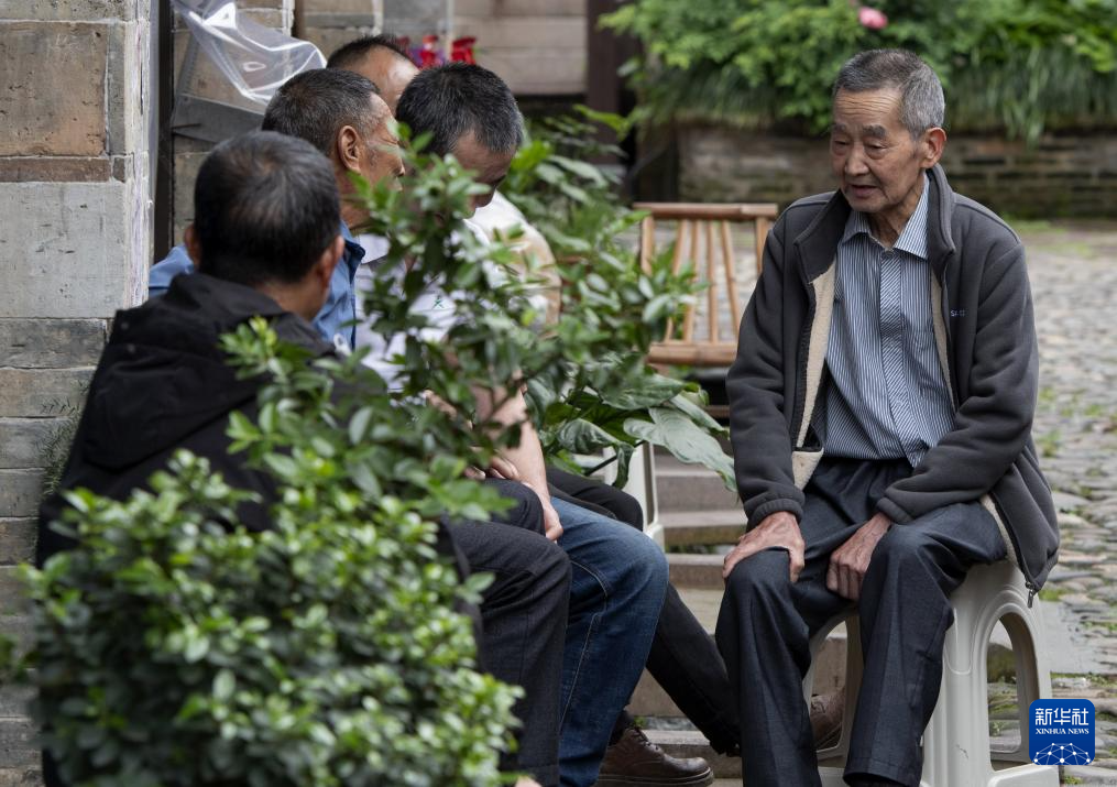 居住在泰宁县尚书巷历史文化街区内的老人们聚在一起聊天(4月19日摄)。