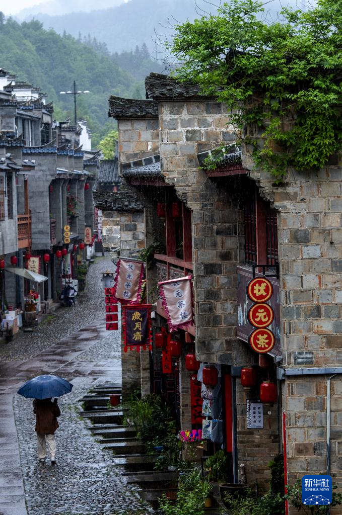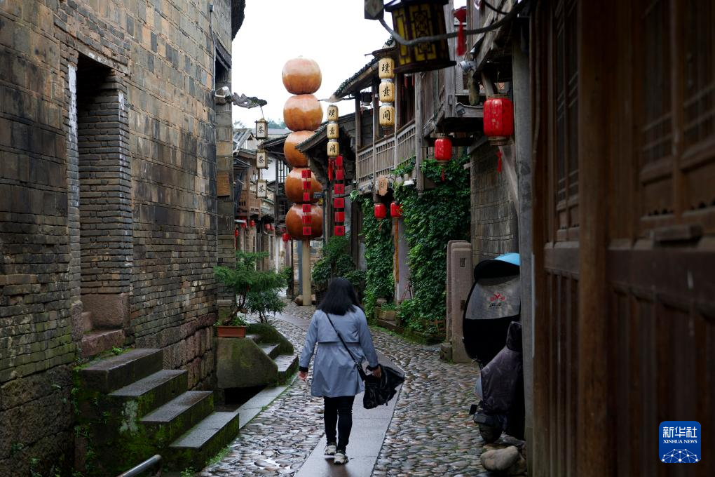居民撑伞走在泰宁县尚书巷历史文化街区(4月19日摄)。