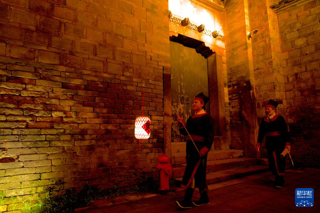 在泰宁县尚书巷历史文化街区内,工作人员进行“古装巡更”展示(4月19日摄)。