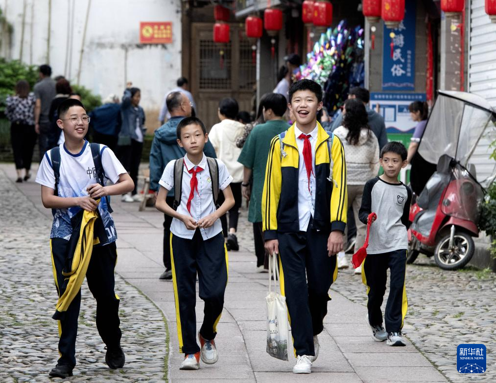 小学生们放学经过泰宁县尚书巷历史文化街区(4月19日摄)。