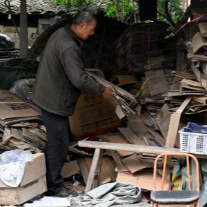 4月25日,在岳西县温泉镇牌坊村,储德素整理回收来的废品。