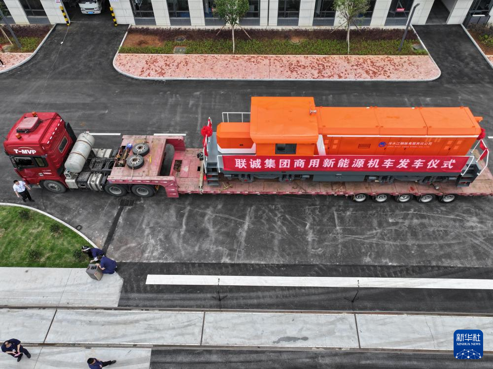 这是4月26日在湖南株洲联诚集团控股股份有限公司拍摄的JN7-2商用新能源机车发车仪式现场(无人机照片)。该车准备通过平板运输车运往冷水江钢铁有限责任公司。