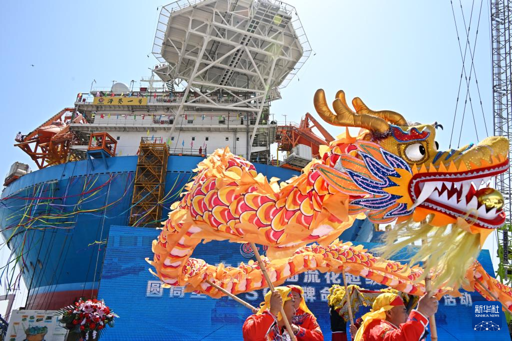 4月26日,青岛海洋工程高新装备制造基地舾装码头,演员在交付活动上表演舞龙。