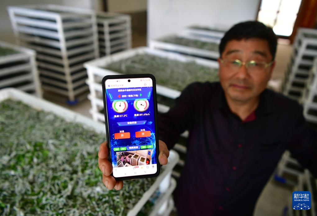 4月26日,在肥西县山南镇金牛蚕桑农民专业合作社,农户展示手机里的自动远程控制系统,通过该系统可以自动调节蚕室的温度和湿度。