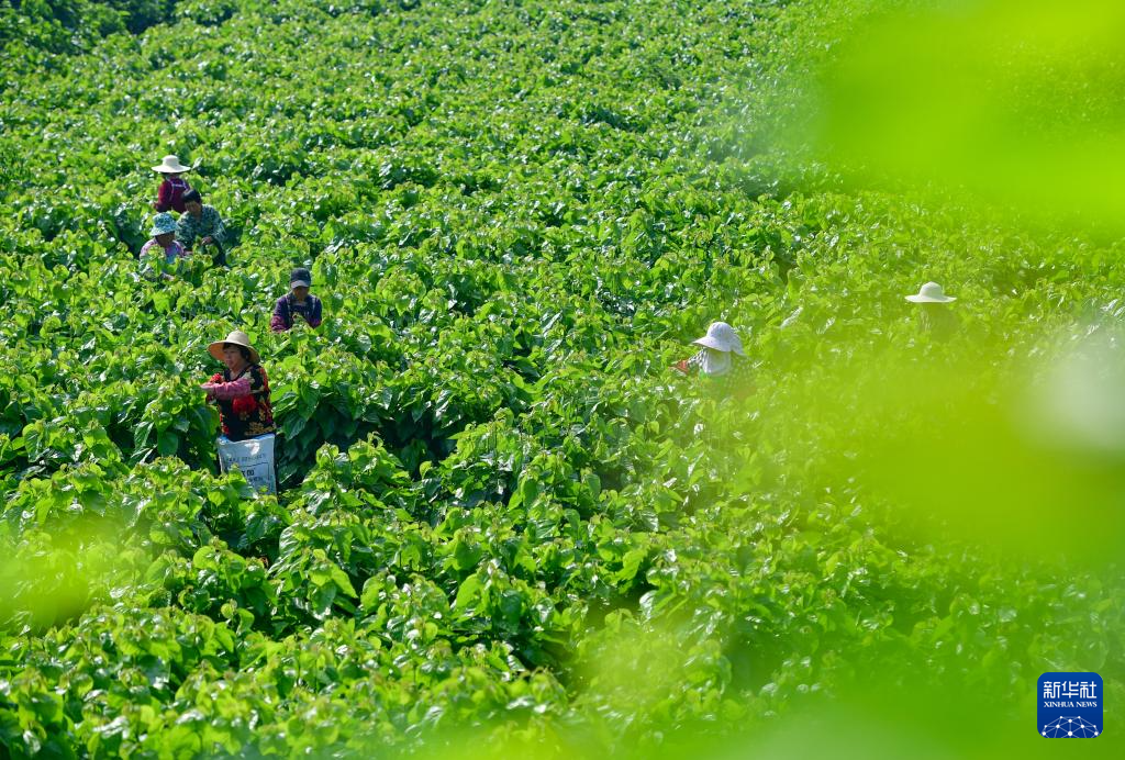 4月26日,在肥西县山南镇金牛蚕桑农民专业合作社桑园种植基地,农户在采摘桑叶。