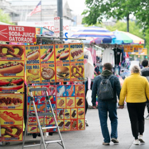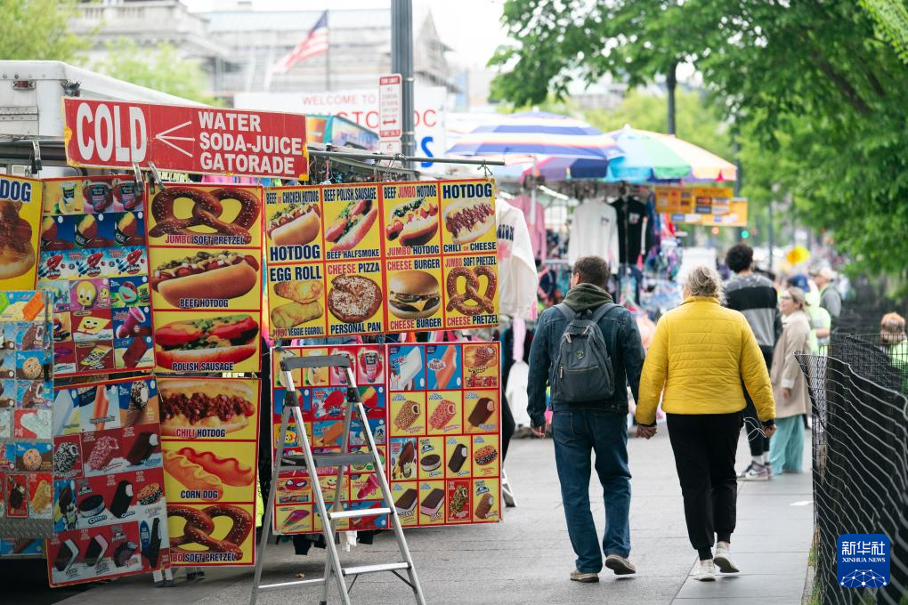 4月25日,在美国首都华盛顿,游客从白宫附近一辆食品售卖车旁经过。