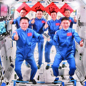 这是4月26日在北京航天飞行控制中心拍摄的神舟十七号航天员乘组欢迎神舟十八号航天员乘组的画面。