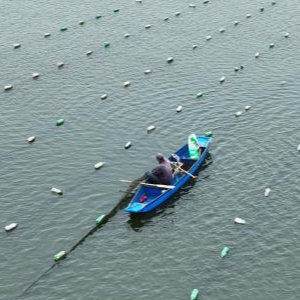 4月27日,蚌农在泗洪县魏营镇先锋水库水面上投放珍珠蚌(无人机照片)。