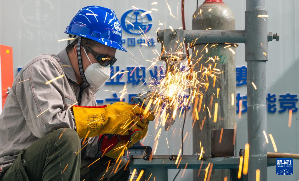 4月27日,来自中铁四局的青年技术能手在焊接实操比赛中比拼。