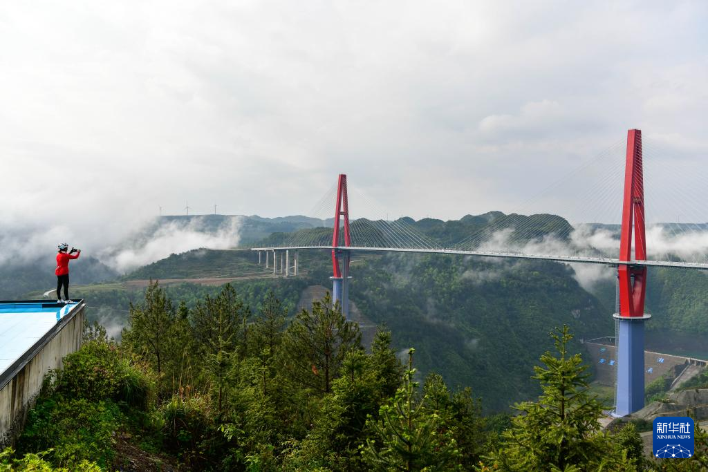 4月27日,一名骑行爱好者在拍摄贵州龙里河大桥。