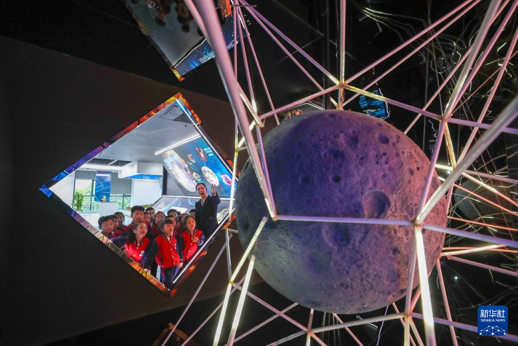 4月24日是第九个“中国航天日”,浙江省湖州市德清县地理信息科技馆的工作人员为孩子们讲解航天科技知识。