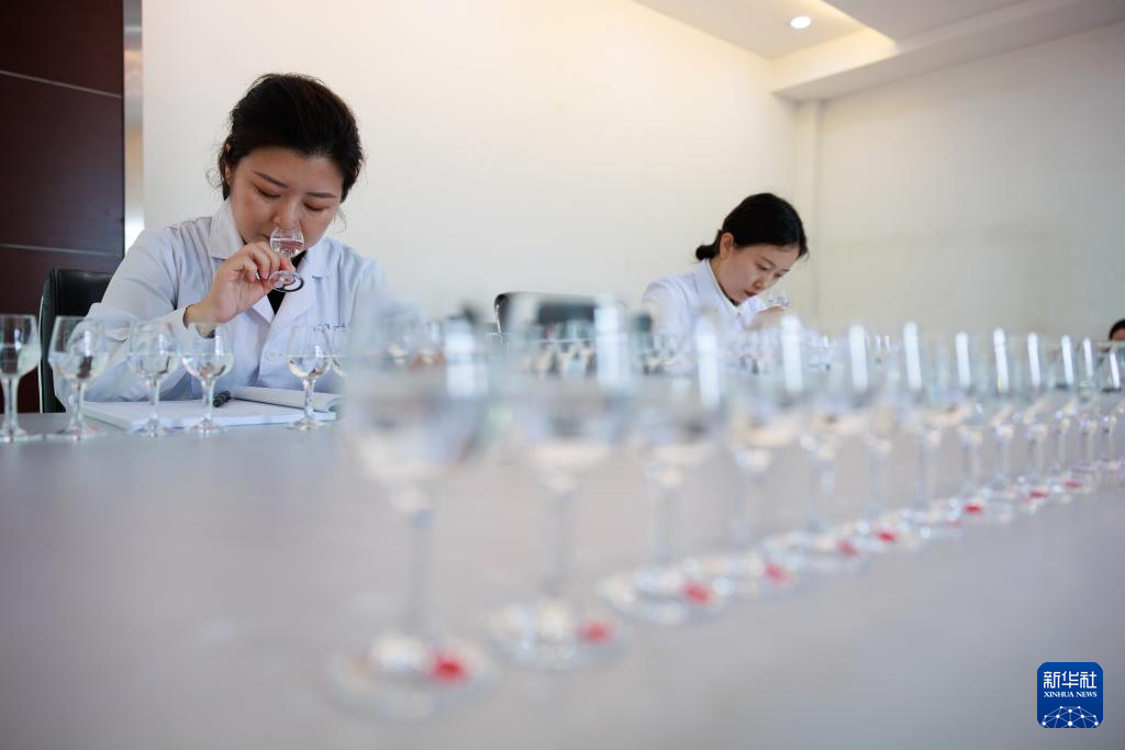 在贵州省遵义市汇川区北郊十字铺贵州珍酒厂区品酒室,王应招(左)进行新酒分级(4月23日摄)。