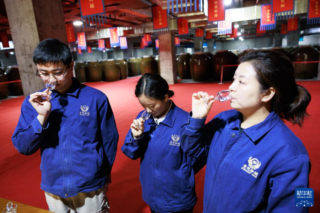 在贵州省遵义市汇川区北郊十字铺贵州珍酒厂区生产车间,王应招(左)带领徒弟一起鉴定酒体度数(4月23日摄)。