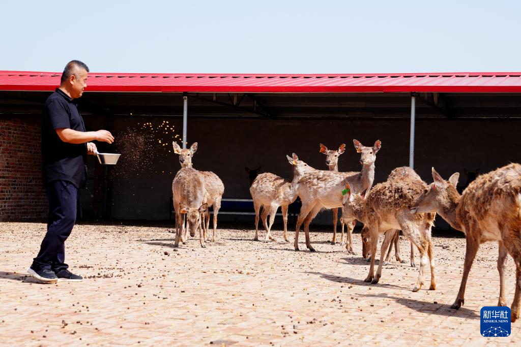 4月27日,在惠民县姜楼镇鹿丰养殖场,工作人员在喂梅花鹿。