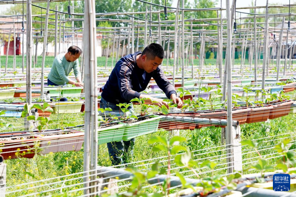 4月27日,在惠民县姜楼镇立冉果蔬种植合作社,工作人员在管护草莓苗。