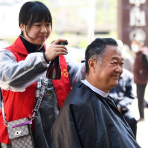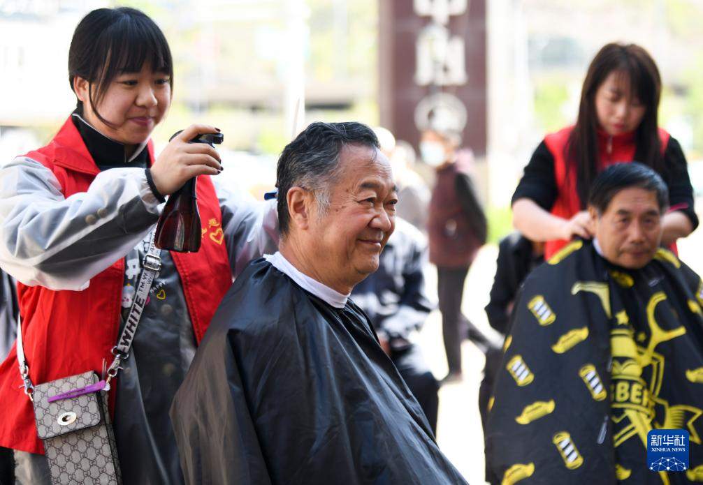 4月27日,来自乌鲁木齐市水磨沟区七纺街道北山社区新时代文明实践站的志愿服务队为居民免费理发。