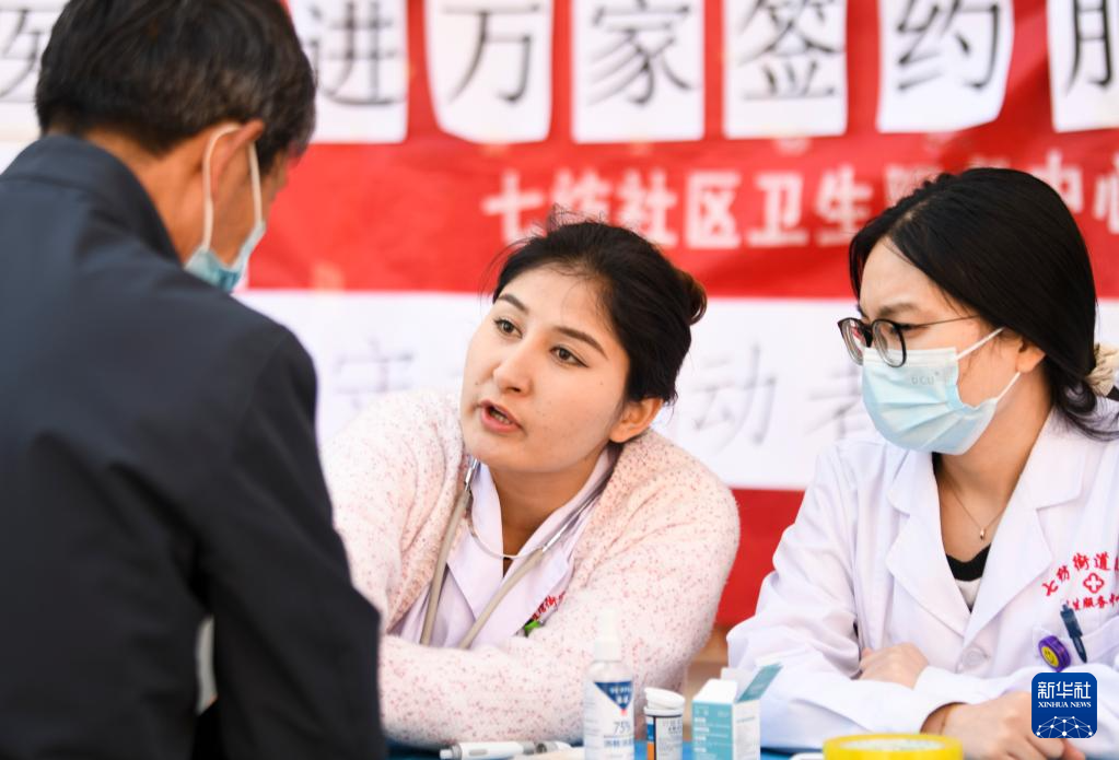 4月27日,来自乌鲁木齐市水磨沟区七纺街道北山社区新时代文明实践站的志愿服务队为居民义诊。