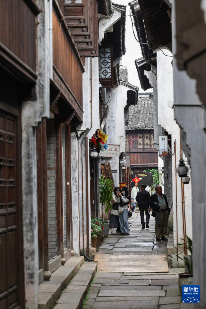 拼版照片:上图为1979年的嘉兴市月河历史街区坛弄(资料照片,庞艺影摄);下图为4月26日拍摄的游客在嘉兴市月河历史街区坛弄游玩(新华社记者江汉摄)。