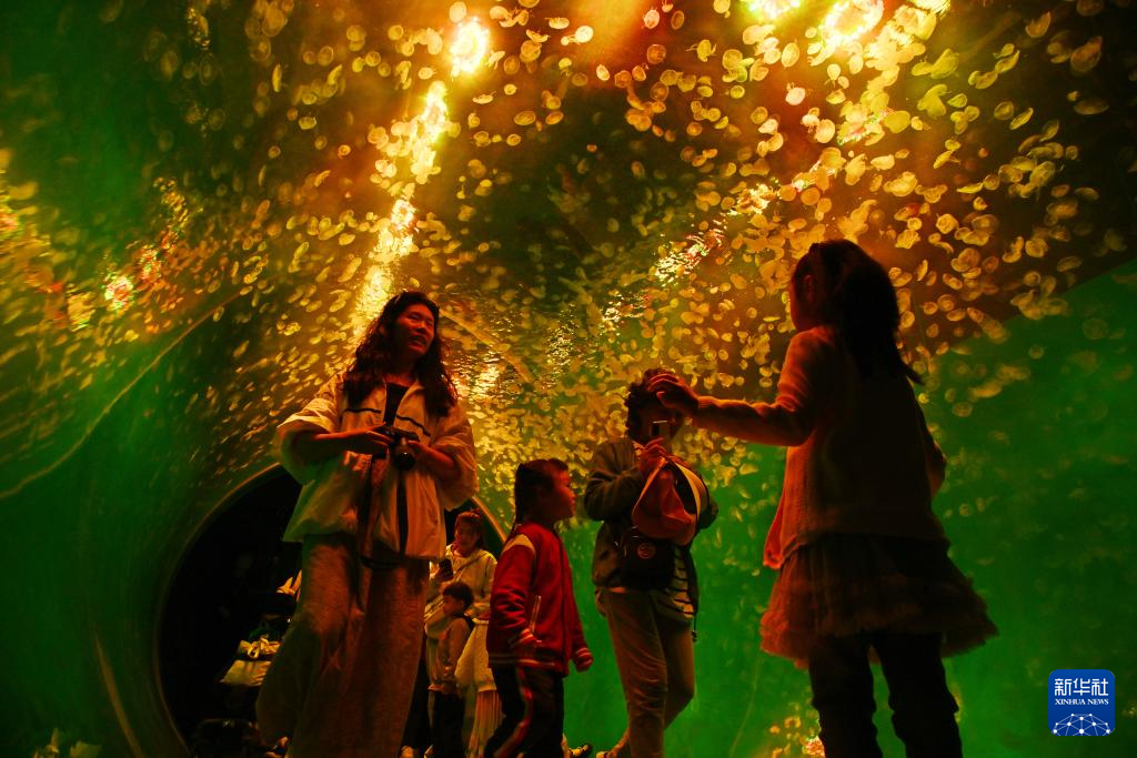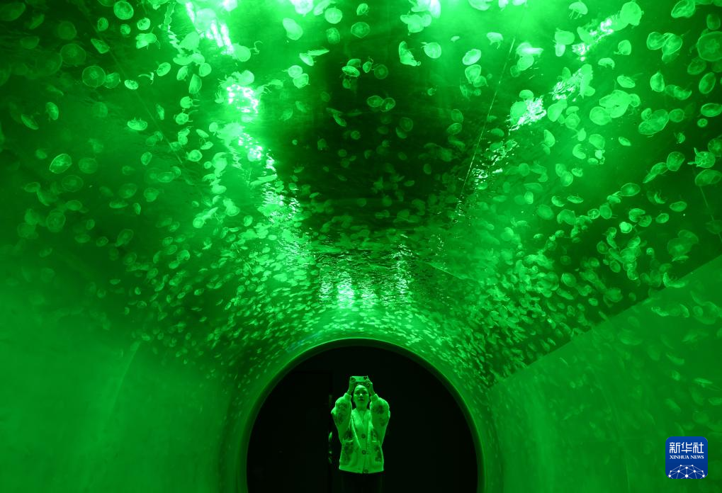 4月28日,游客在全透明亚克力隧道内观赏水母。