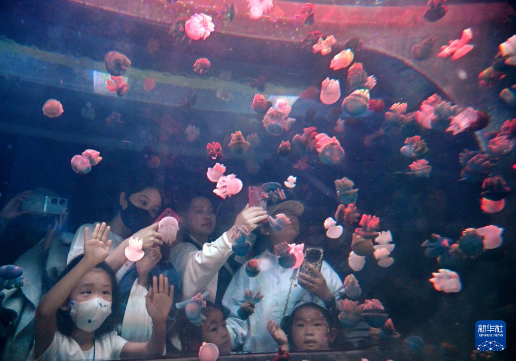 4月28日,游客在观赏、拍摄水母。