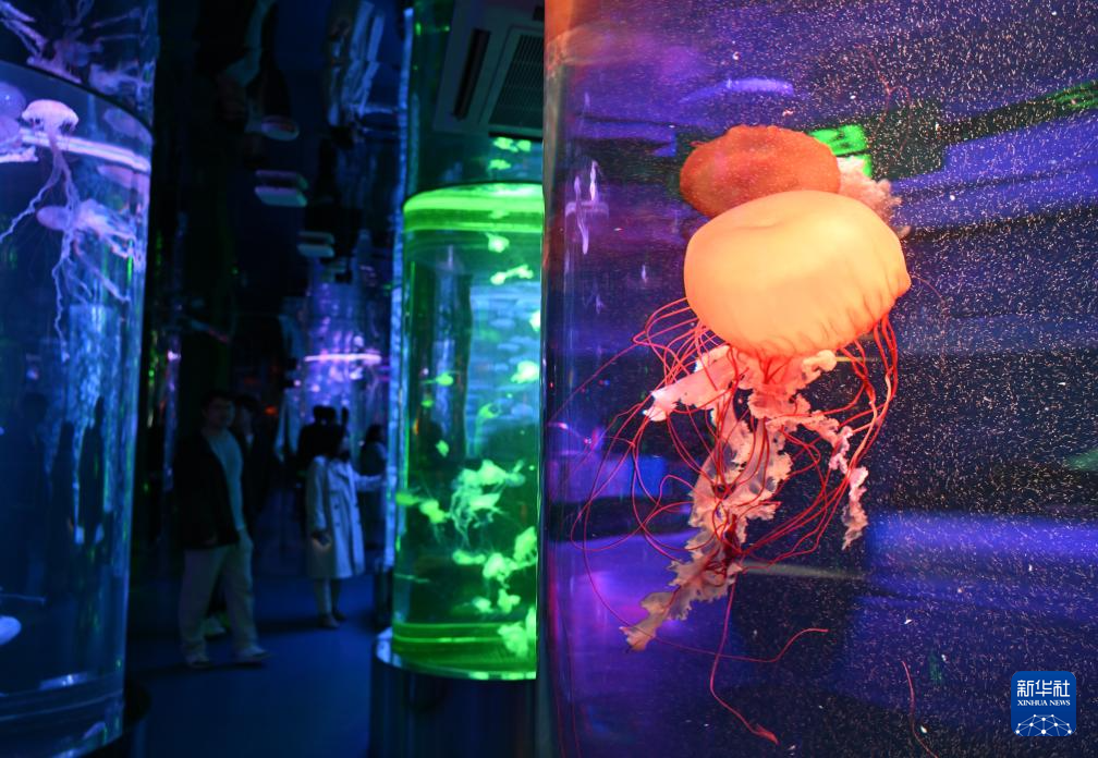 4月28日,游客在观赏水母。