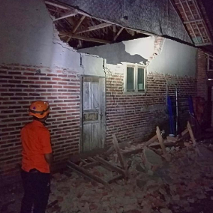 4月28日,在印度尼西亚西爪哇省的打横,救援人员站在一处被地震损毁的房屋前。
