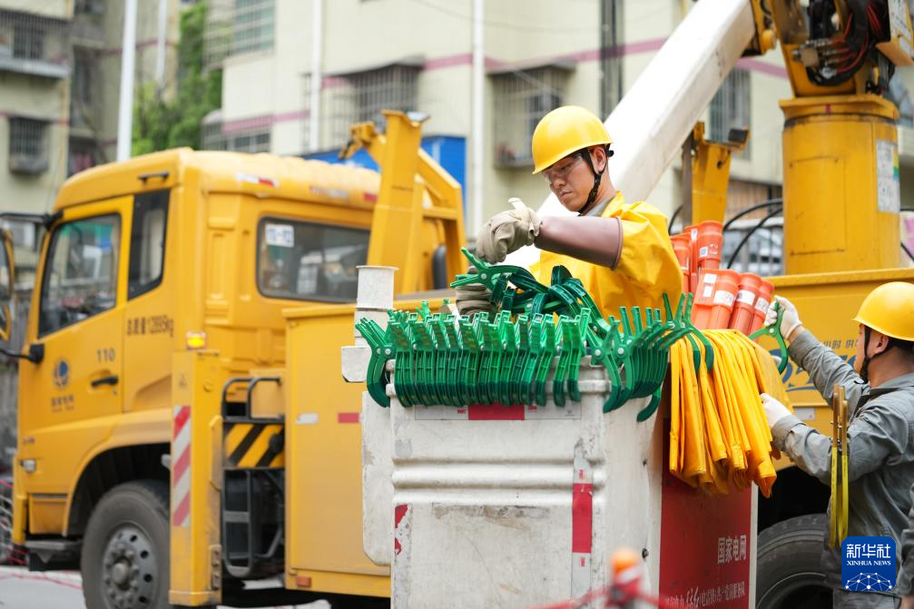 4月24日,在湖南省长沙市岳麓区一小区,贺彪(左)和同事进行带电作业前的准备。