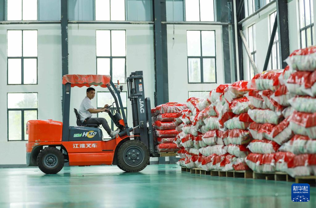 4月29日,工人在贵州省黔东南苗族侗族自治州岑巩县一家制种公司生产车间搬运稻种。