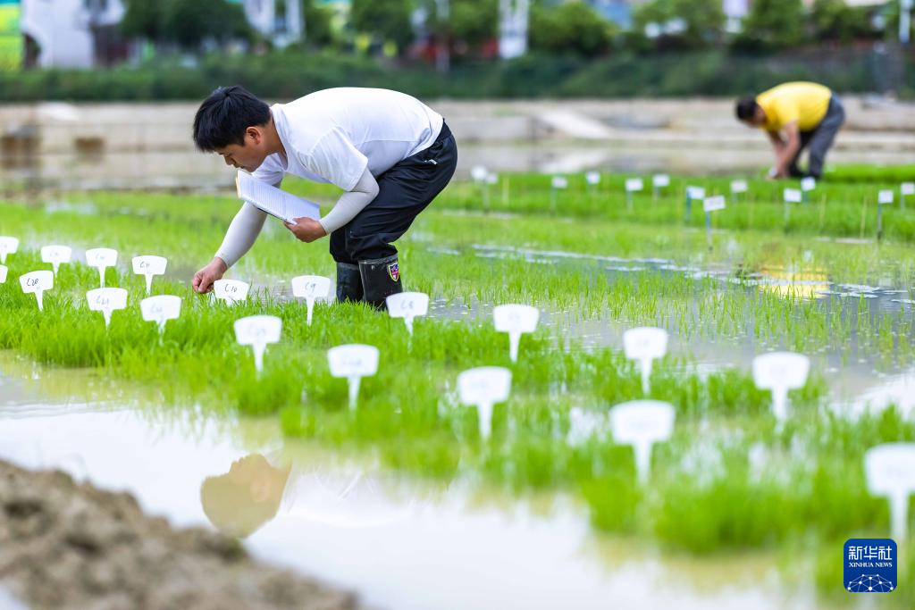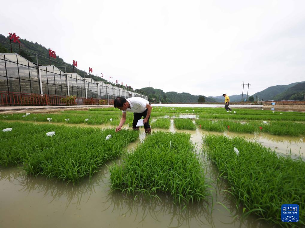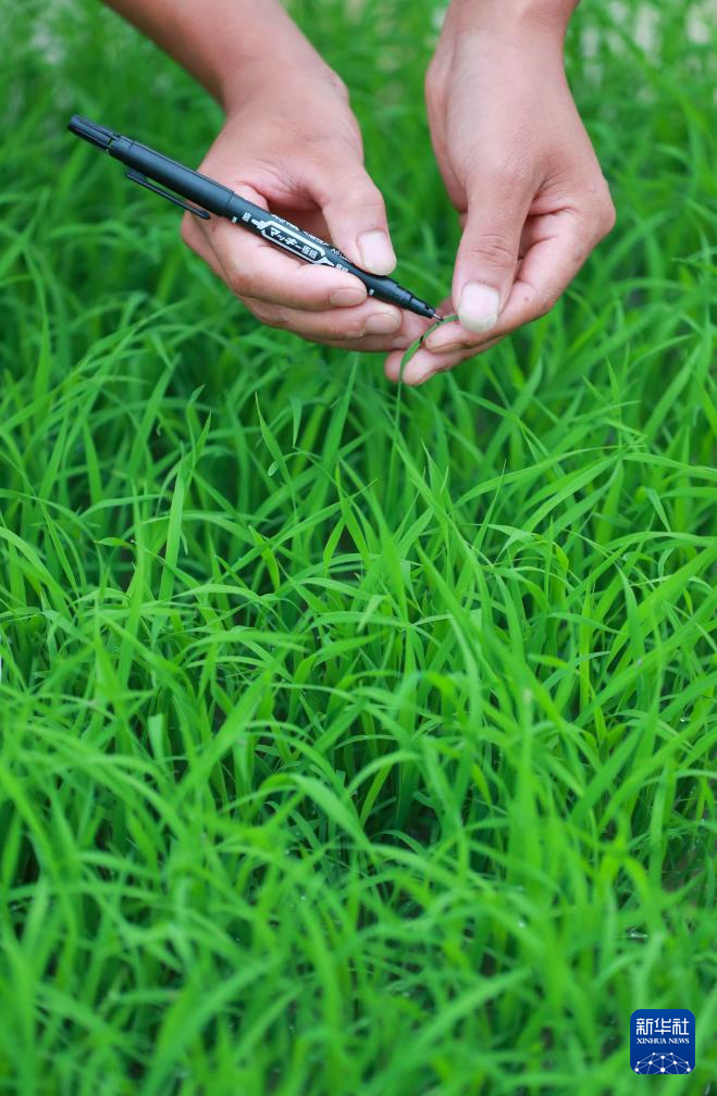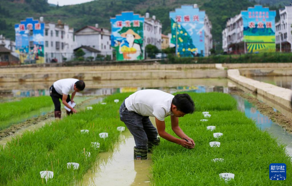 4月29日,技术人员在贵州省黔东南苗族侗族自治州岑巩县杂交水稻制种试验田查看水稻长势。