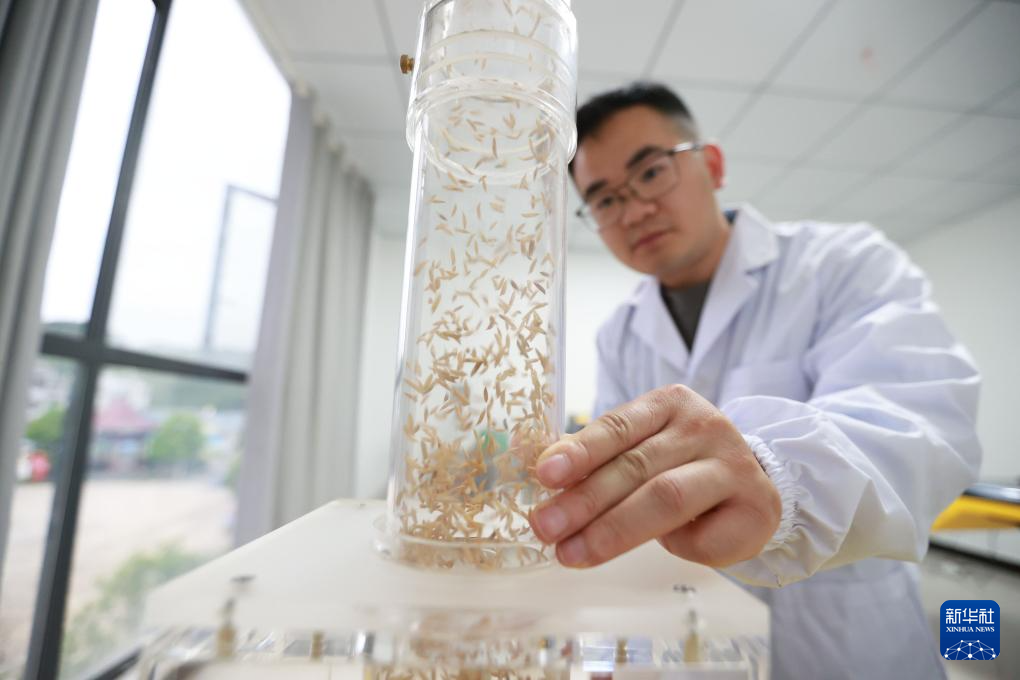 4月29日,技术人员在贵州省黔东南苗族侗族自治州岑巩县一家制种公司的实验室内挑选合格的稻种。