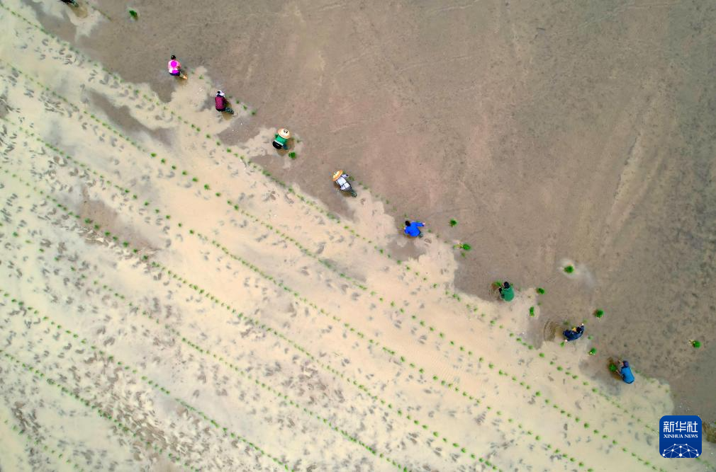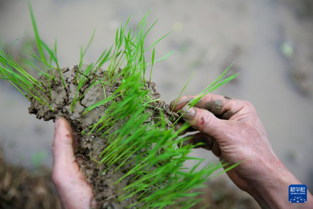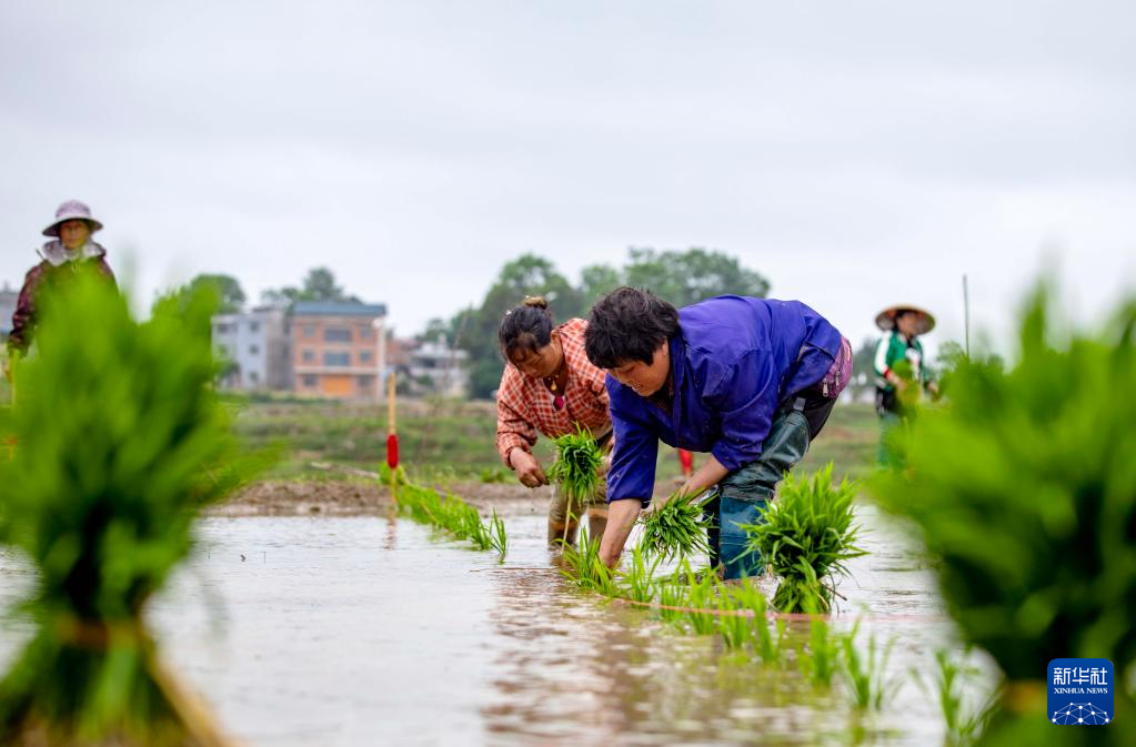 4月29日,村民在贵州省黔东南苗族侗族自治州岑巩县水尾镇水稻制种基地移栽秧苗。