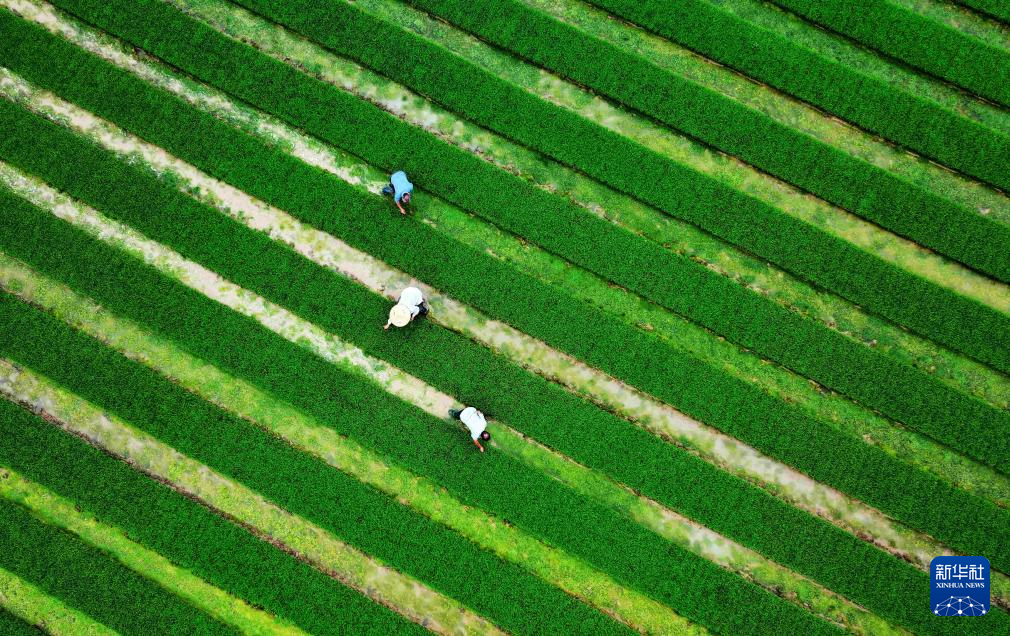 4月29日,村民在贵州省黔东南苗族侗族自治州岑巩县羊桥土家族乡祝坝村管护杂交水稻制种秧苗(无人机照片)。