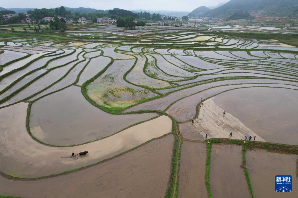 4月29日,村民在贵州省黔东南苗族侗族自治州岑巩县水尾镇水稻制种基地犁田插秧(无人机照片)。