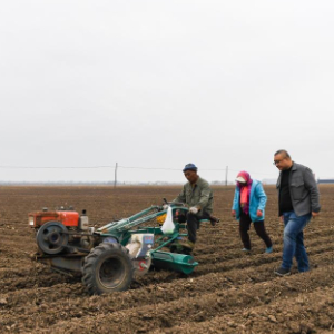 4月28日,在鑫丰种植农民专业合作社,金天(左一)在查看播种情况。