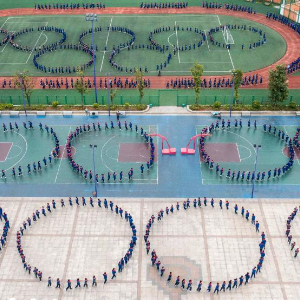 4月29日,学生在贵州省岑巩县羊桥土家族乡中心小学参加民族特色大课间活动(无人机照片)。
