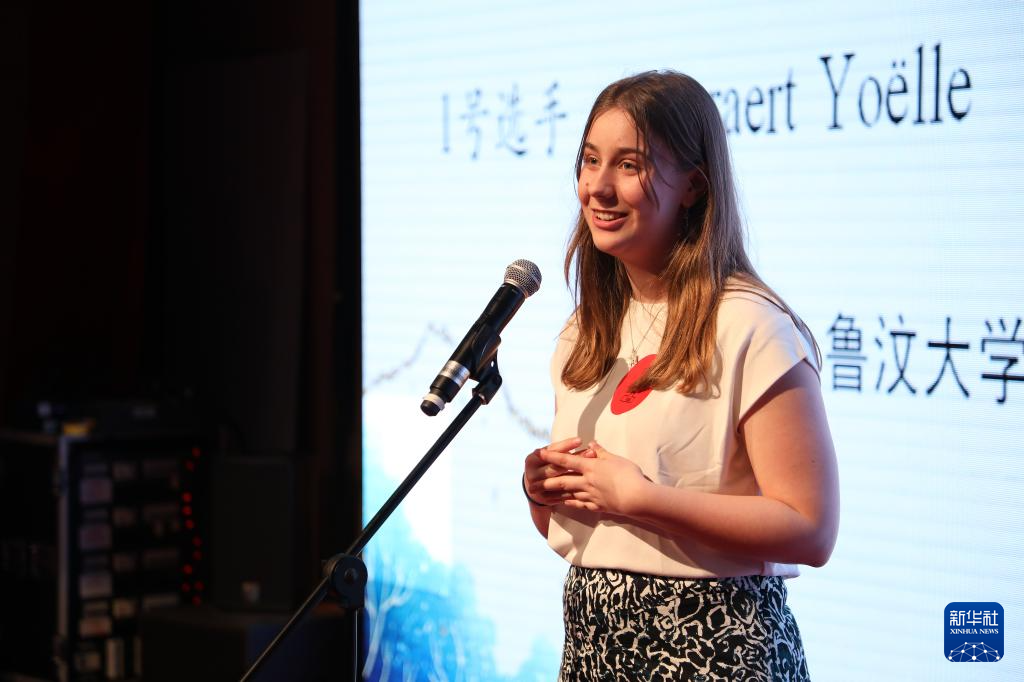 4月28日,在比利时布鲁塞尔,参赛选手在“汉语桥”世界大学生中文比赛比利时赛区决赛中展示才艺。