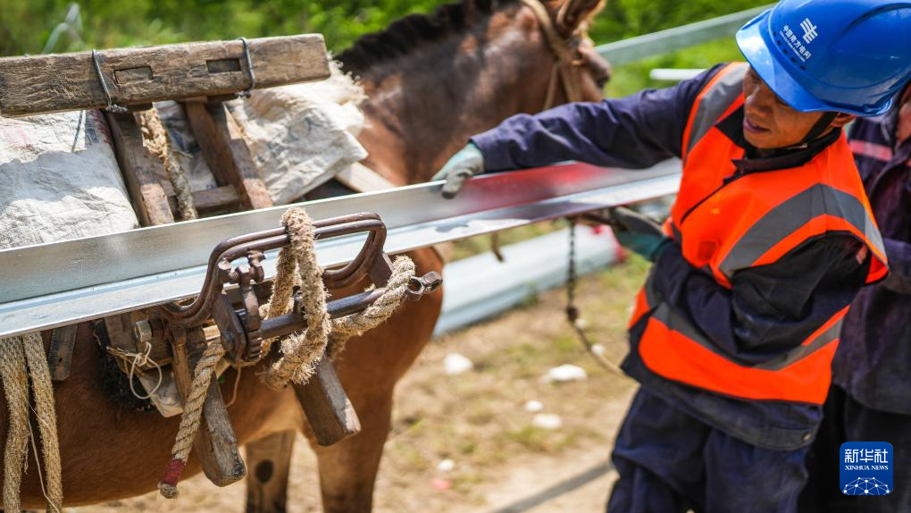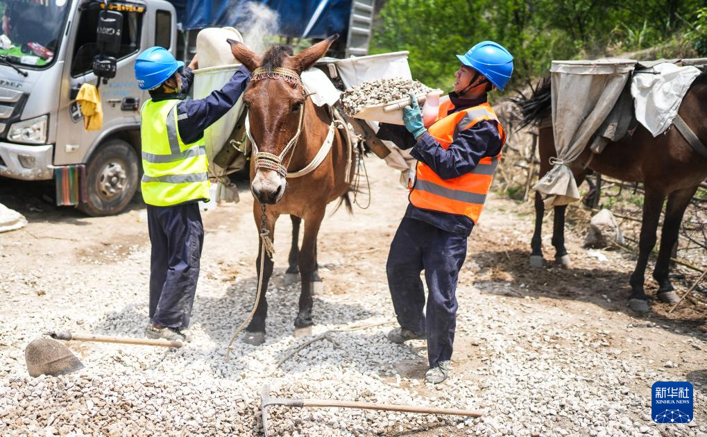 工人在给骡子装载建设小型铁塔所需的施工材料(4月29日摄)。