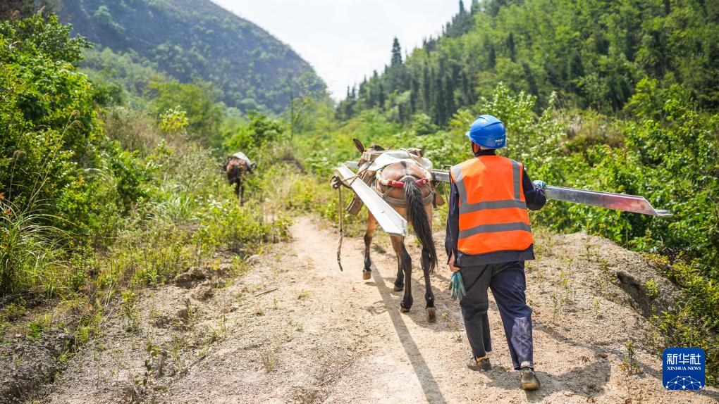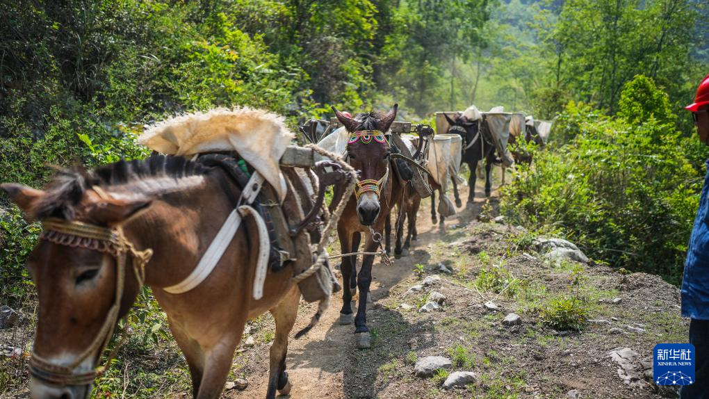 装载施工材料的骡队缓步往大山深处走去(4月29日摄)。