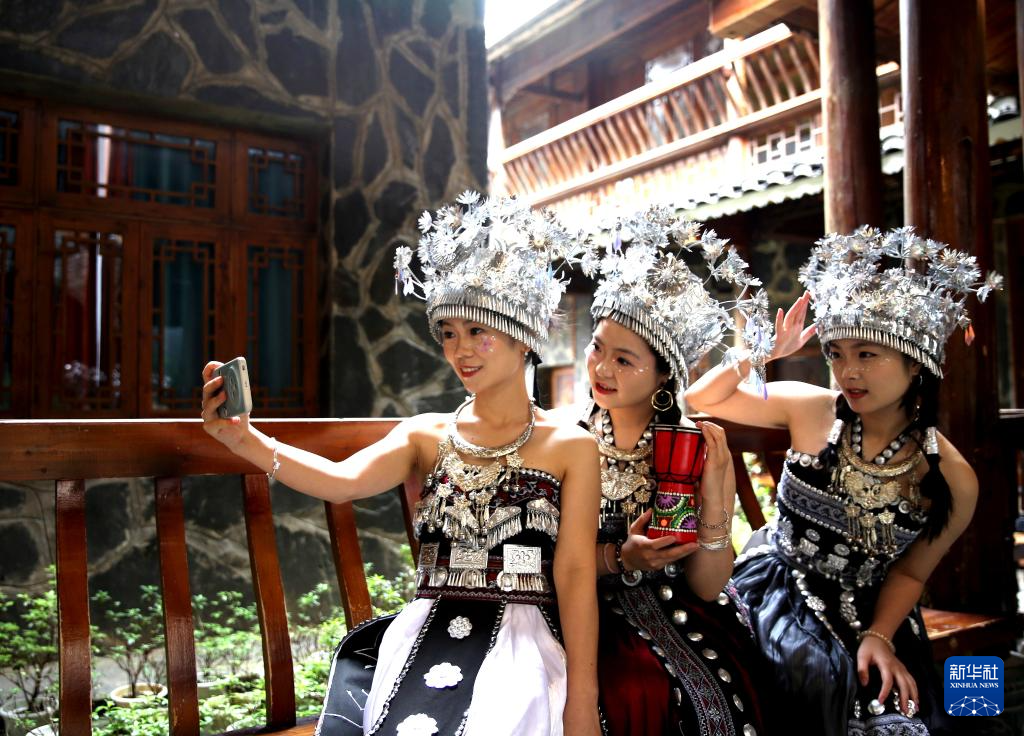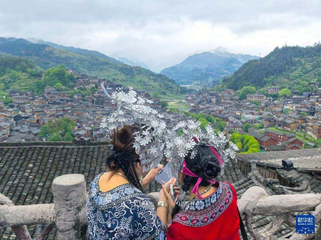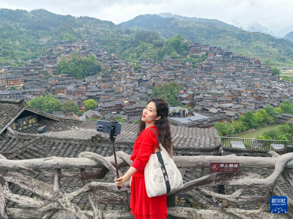 4月30日,游客在西江千户苗寨观景台上自拍。