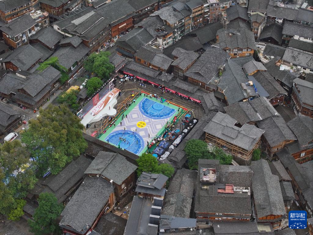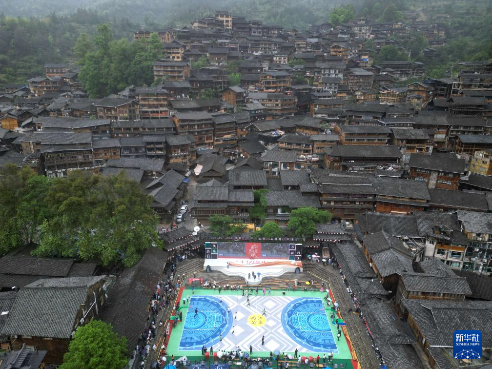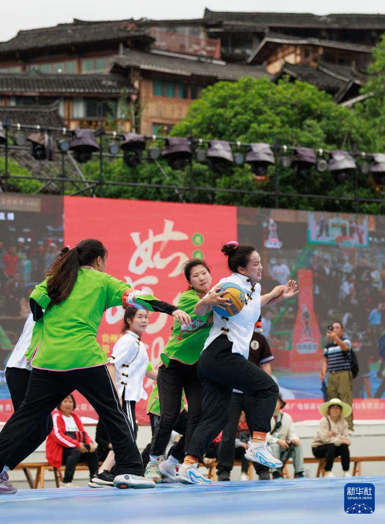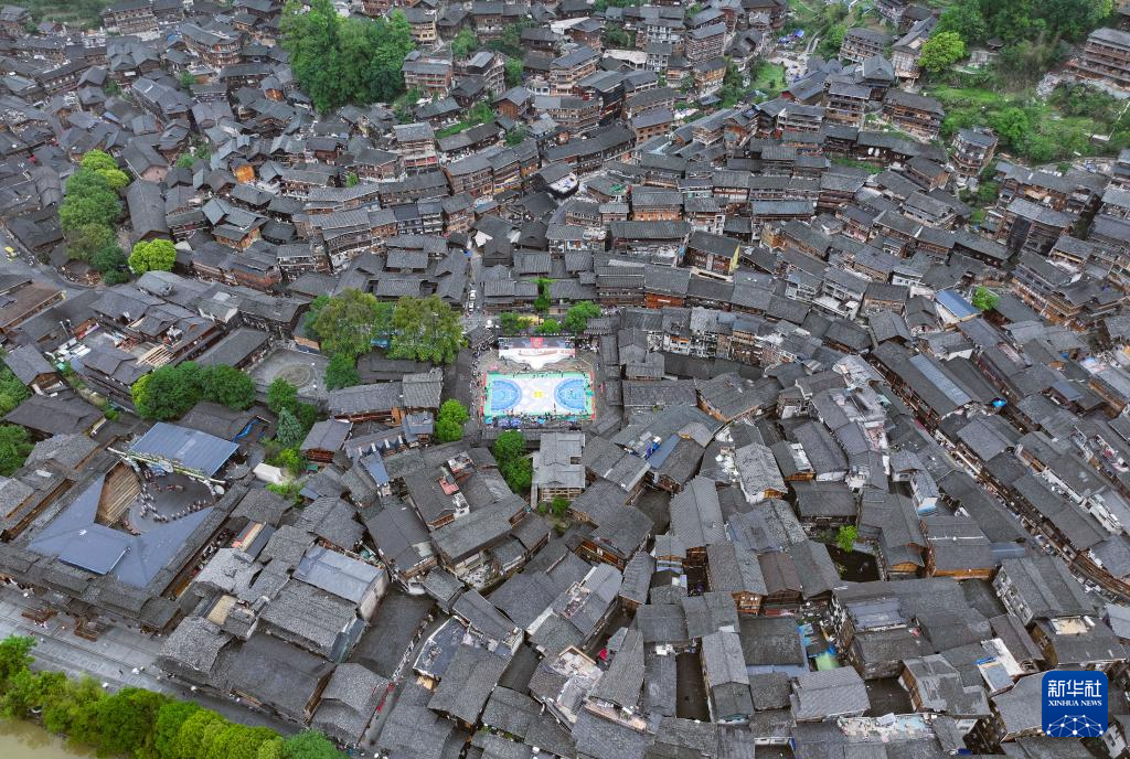 4月30日,“姑妈篮球赛”在西江千户苗寨内进行(无人机照片)。