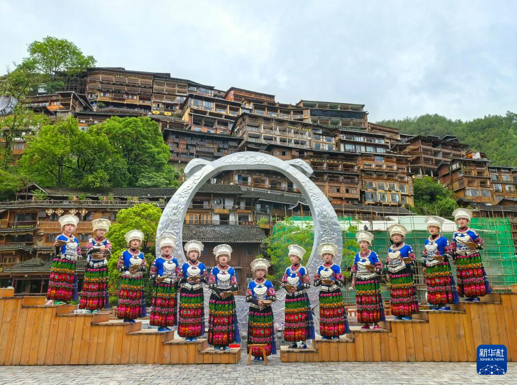 4月30日,景区工作人员在西江千户苗寨内迎接游客。