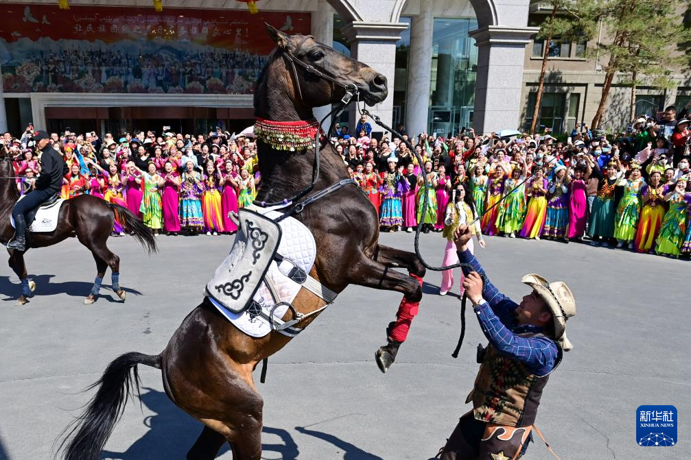 这是4月30日在新疆乌鲁木齐市举行的巡游活动上拍摄的舞蹈表演。