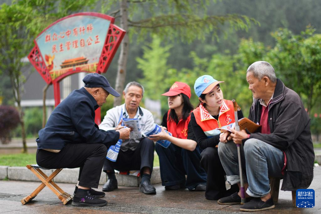 4月30日,志愿者在贵州省黔东南苗族侗族自治州岑巩县大有镇大坪同心社区给居民普及法律知识。
