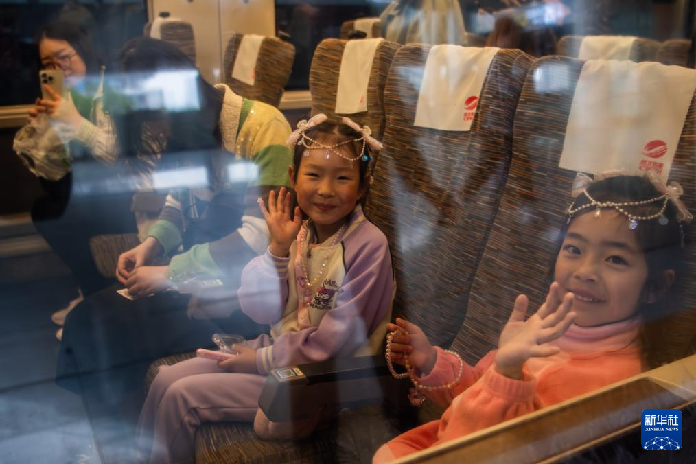 5月1日,在武汉站,两名小朋友在G66次列车上等待出发。