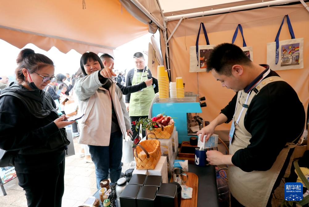 5月1日,咖啡店的工作人员(右)在活动现场制作咖啡。