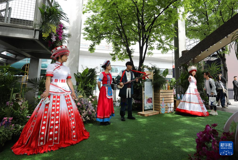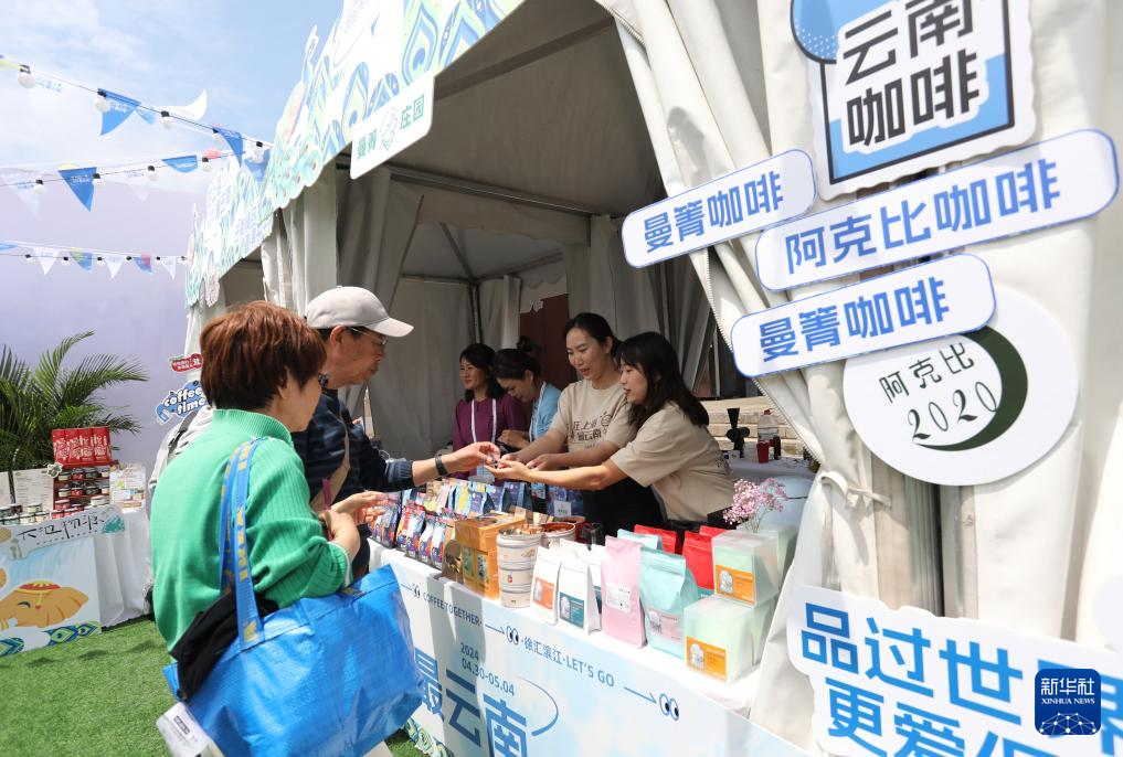 5月1日,身着民族服装的工作人员站在云南咖啡推介展区内。